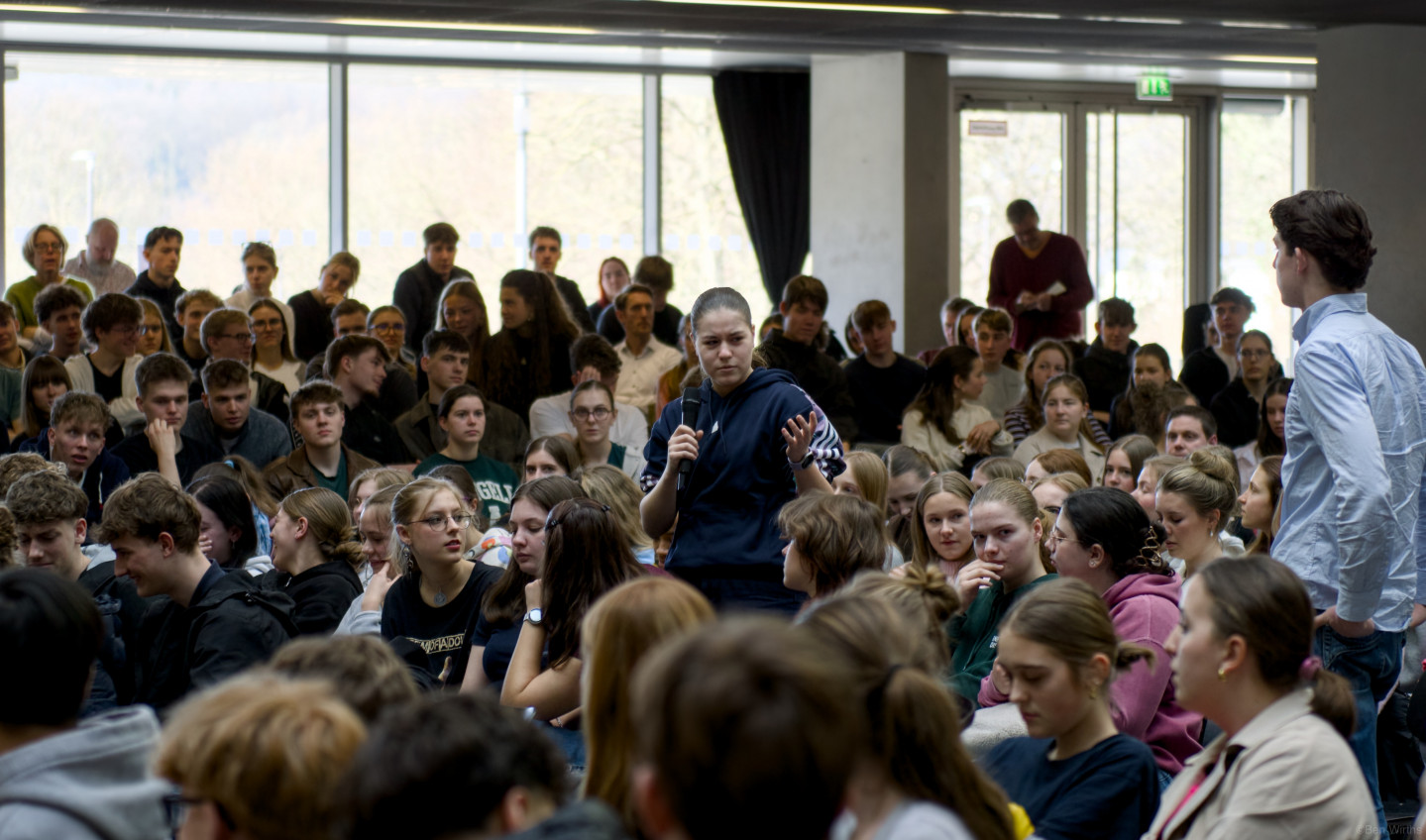 „Es ist toll, dass das Mariengymnasium die Bundeswehr auf den Berufemarkt einlädt oder mit ihr eine Fahrt nach Berlin organisiert, damit ihr euch mit dem Thema ‚Militär‘ auseinandersetzen und für euch beantworten könnt: ‚Wo finde ich mich selbst?‘“, gab der Bischof den Jugendlichen mit auf den Weg, bevor diese selber in einen regen Austausch mit dem Militärbischof kommen konnten. „Ihr dürft mich ruhig alles fragen.“, betonte er dabei. Das war auch genau das, was das interessierte Publikum des Mariengymnasiums tat. Mit Fragen rund um die Gleichberechtigung in Deutschland und der Kirche, dem Einsatz in Afghanistan sowie den Missbrauchsfällen in der katholischen Kirche, meldeten sich die Jugendlichen zu Wort.