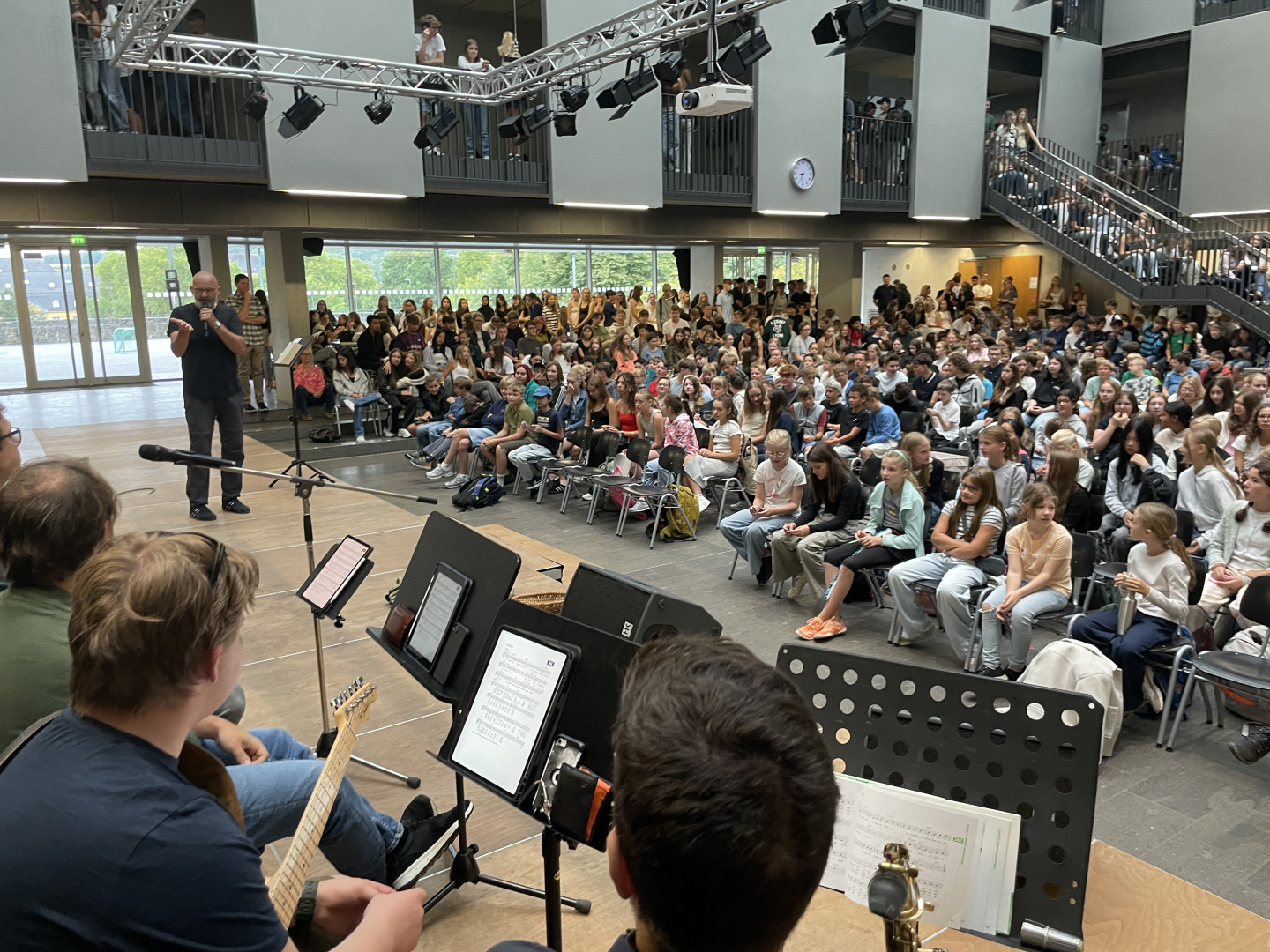 Ein Highlight war heute das Lied des Unterstufenchors, das Andreas Wickel für diesen Anlass komponiert und getextet hat. „Wir wünschen dir einen grandiosen ersten Tag" - so ertönte es schmissig und mitreißend durchs Forum, begleitet von der Big Band und der Band des MGW.