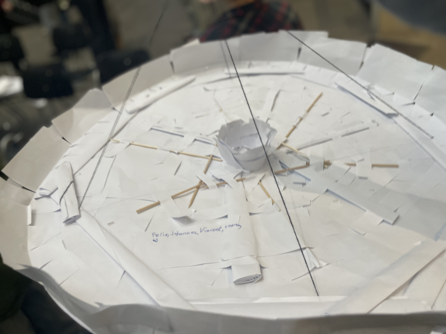 Die Teams sollten einen Fallschirm bauen, der einen Tennisball transportieren und möglichst langsam zu Boden gleiten sollte - und das nur mit den Materialien Papier, Klebe, Holzspieße und Nähgarn.