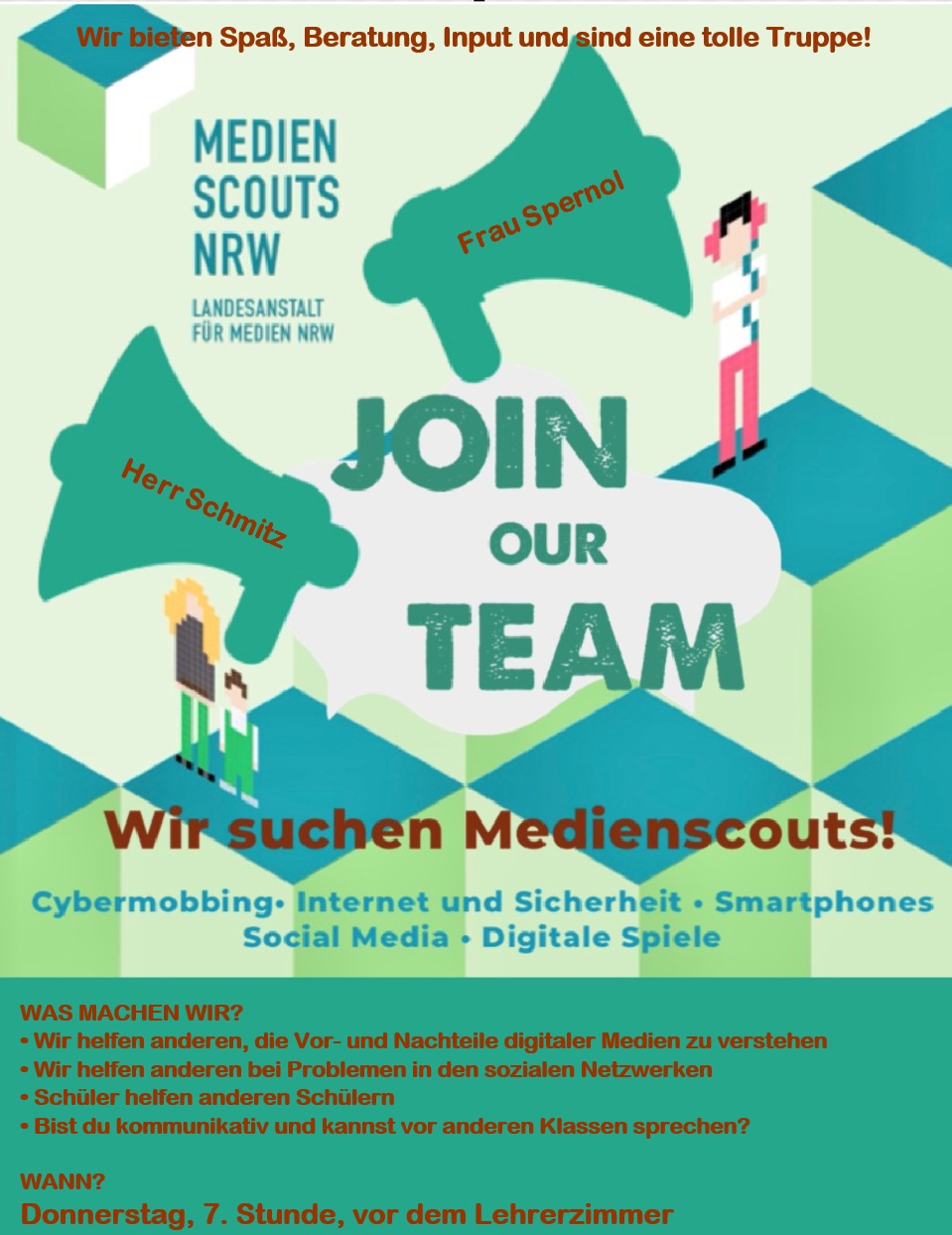 Seit einigen Jahren bilden wir an unserer Schule Medienscouts  aus, die in Fragen rund um die digitalen Medien helfen. Insbesondere bei Themen wie Cybermobbing und Sicherheit im Internet sind unsere Medienscouts gefragt.