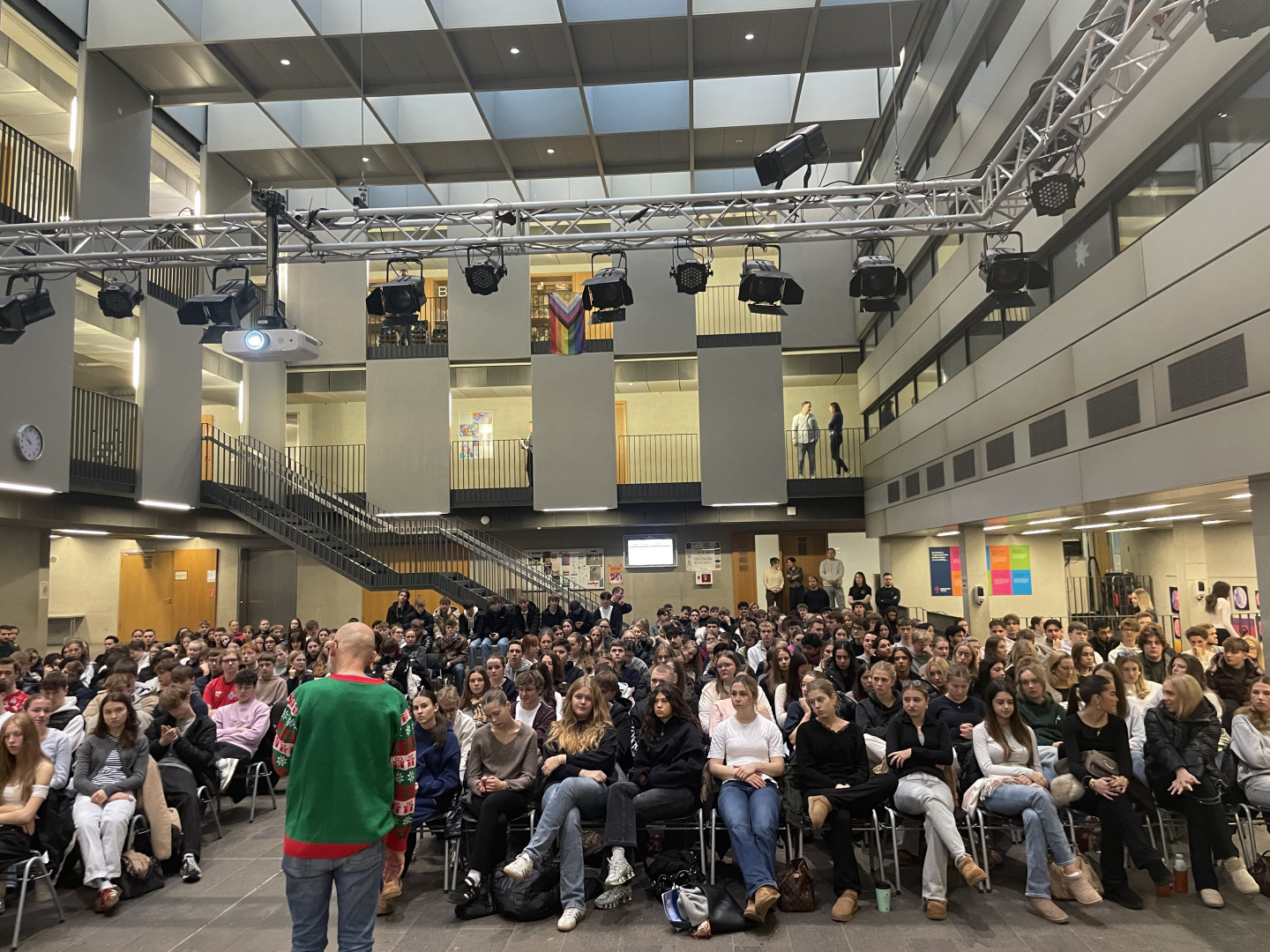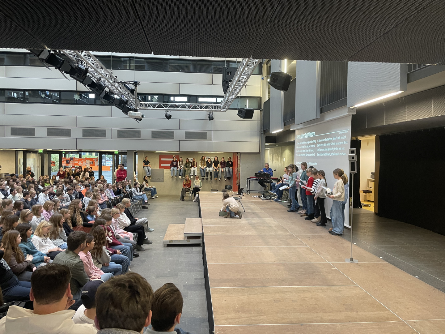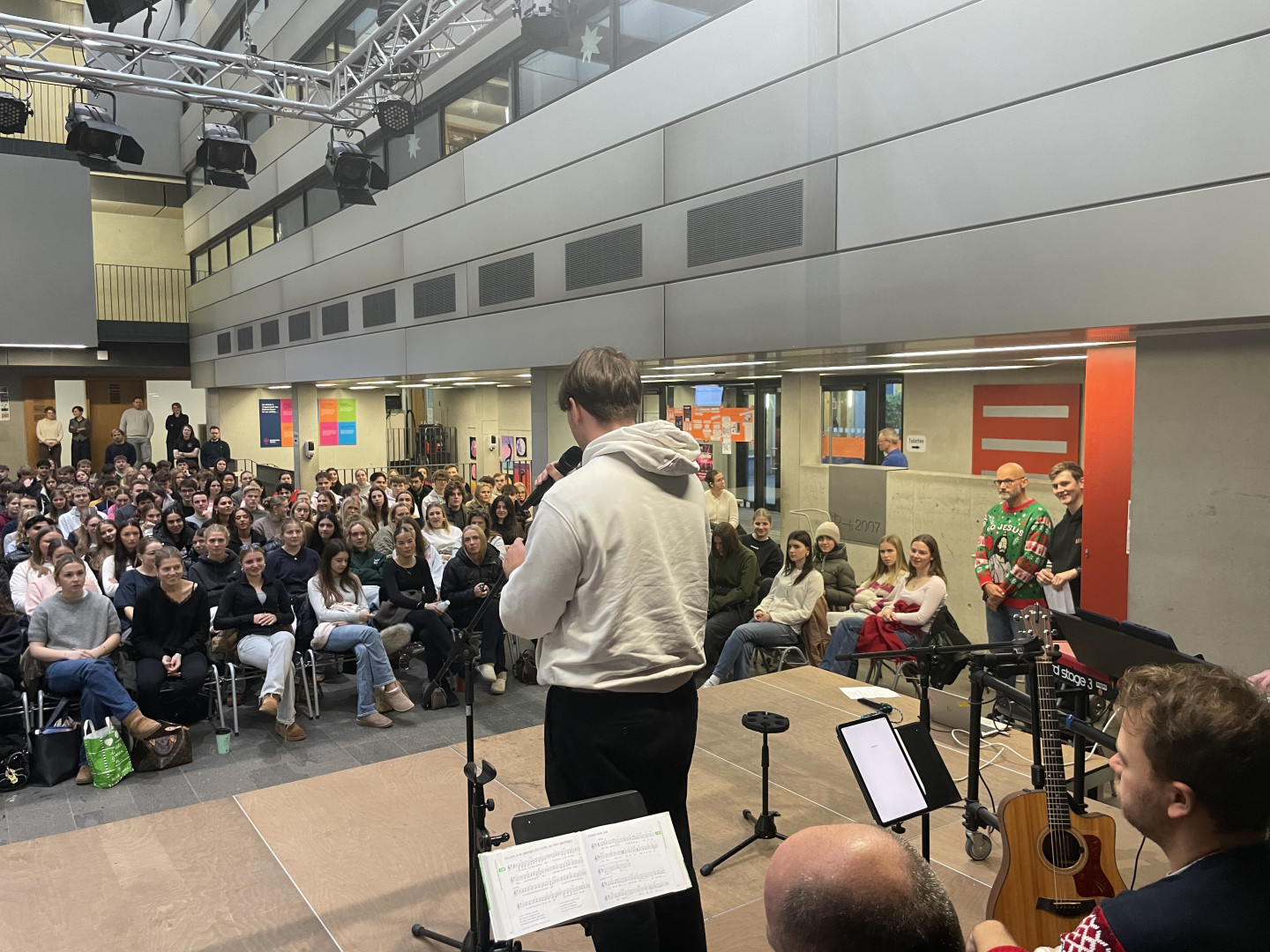 Ein besonderer Dank geht auch Mykola Butsko, der in den Gottesdiensten mit seiner Version des Cohen-Klassikers „Halleluja" für einen Gänsehautmoment sorgte. Begleitet wurde Mykola von Matteo Solbach, beide Schüler der Q2. Vorbereitet wurde der Gottesdienst von der 5b unter Leitung von Jana Wittig. Die Schülerinnen stellten unter anderem verschiedene landestypische Weihnachtsbräuche vor, um auf die weltumspannende Botschaft des Weihnachtsfestes hinzuweisen.