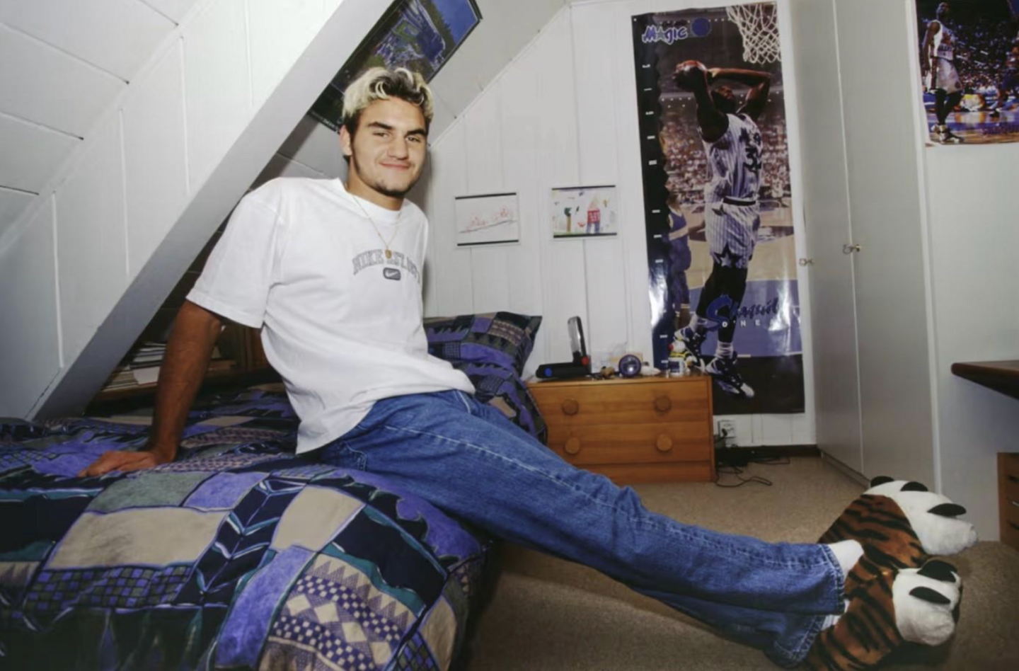 Der junge Roger Federer in seinem Kinderzimmer mit einem Shaquille-O'Neal-Poster an der Wand und mit Tigerpantoffeln an den Füßen.